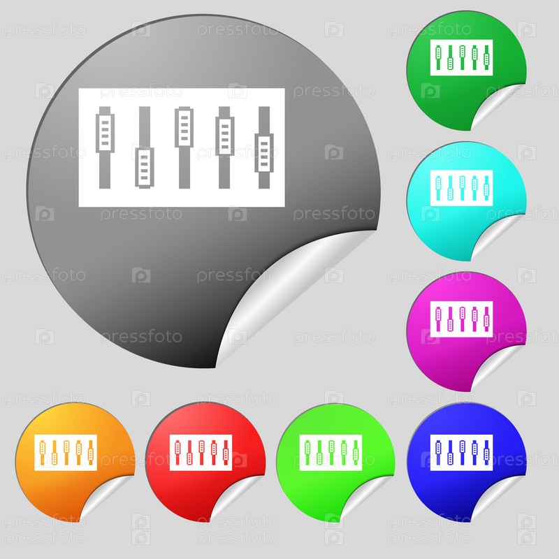Диджей-консоли микс ручки и кнопки значок символа. набор из восьми цветовых круглых кнопок, стикеров. вектор