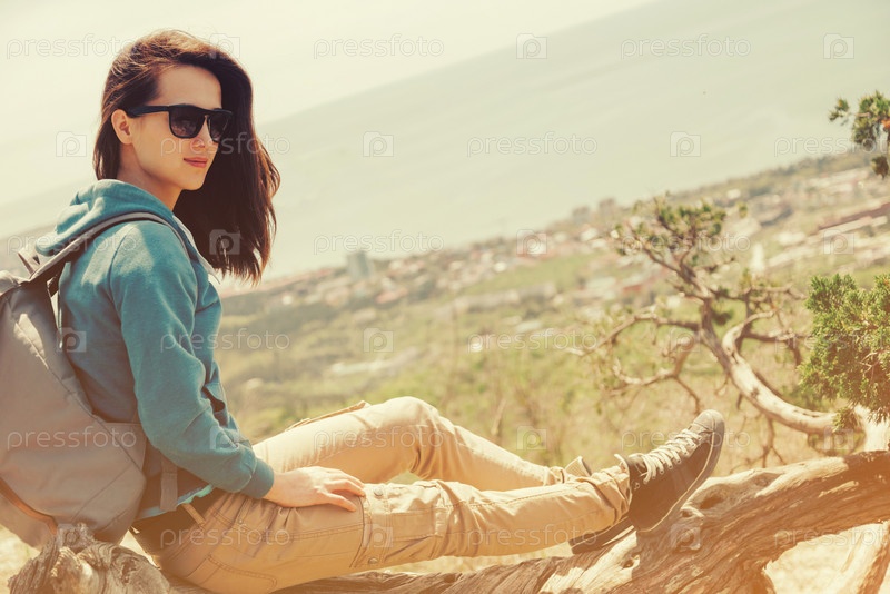 Девушка отдыхает сидя на дереве