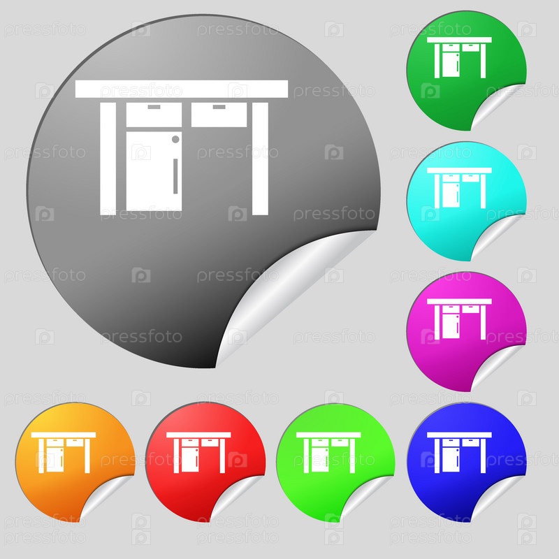 Таблица значок знак. Набор из восьми цветные круглые кнопки, наклейки. Вектор