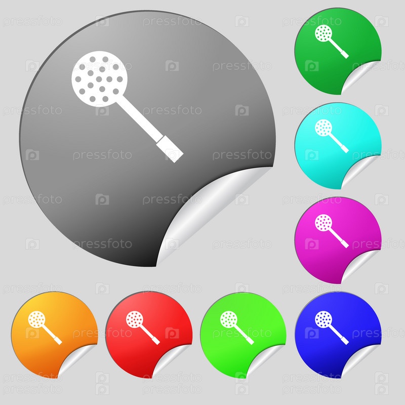 Кухонные приборы значок знак. Набор из восьми цветные круглые кнопки, наклейки. Вектор