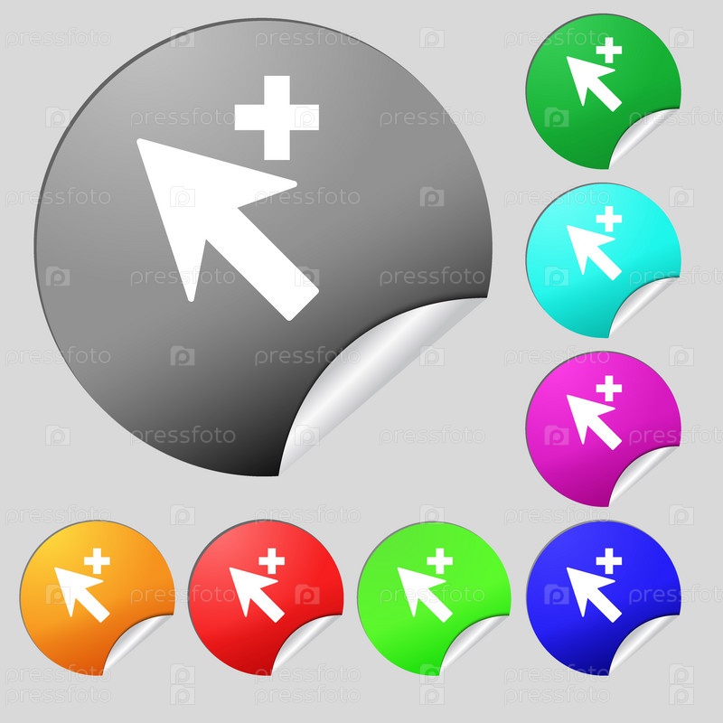Курсор, стрелку плюс, добавьте значок знак. Набор из восьми цветные круглые кнопки, наклейки. Вектор