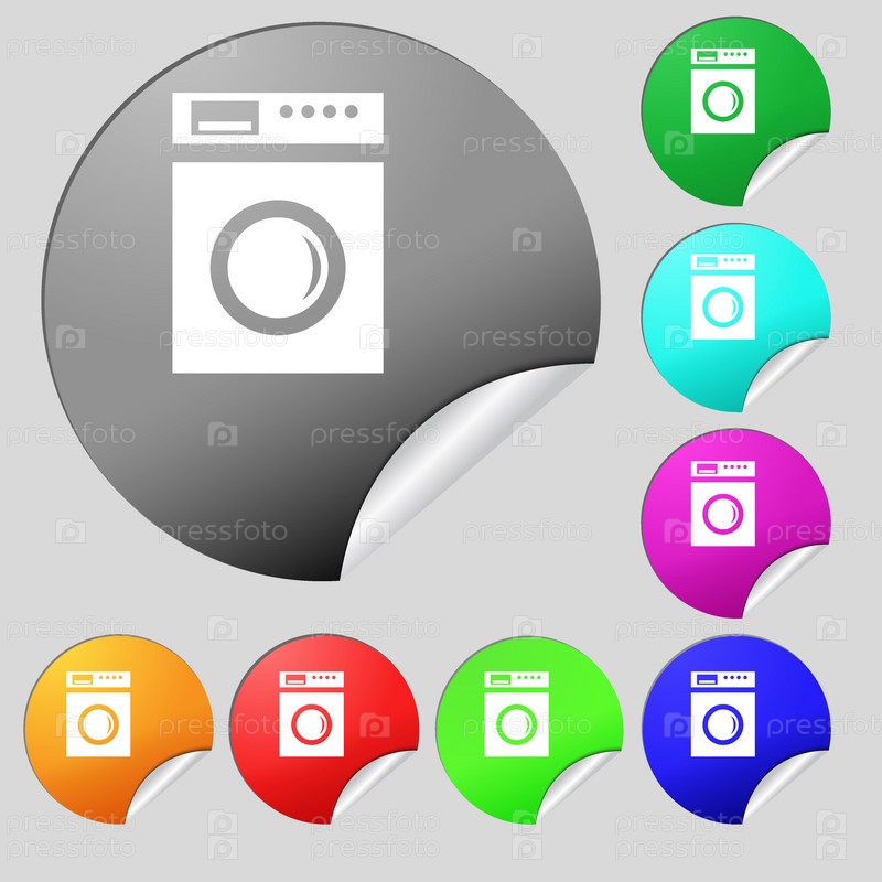 Стиральная машина значок знак. Набор из восьми цветные круглые кнопки, наклейки. Вектор
