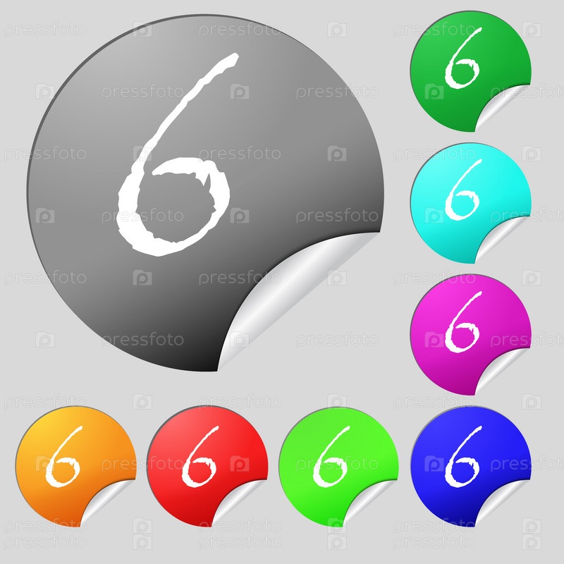 Номер шесть значок знак. Набор из восьми цветные круглые кнопки, наклейки. Вектор
