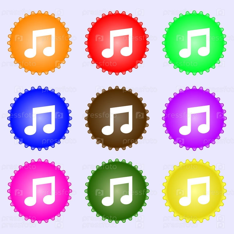 Музыка Примечание знак значок. Музыкальным символом. Набор из девяти различных цветных этикеток. Вектор