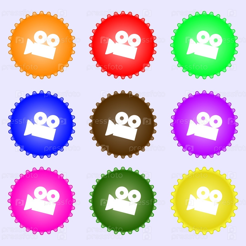 Иконка Видеокамера знак. Кнопка «содержимое». Набор из девяти различных цветных этикеток. Вектор