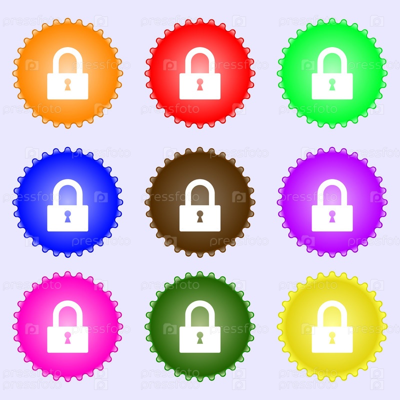 Значок замка знак. Локера символ. Набор из девяти различных цветных этикеток. Вектор