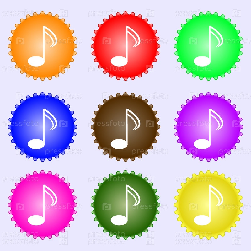 Музыка Примечание знак значок. Музыкальным символом. Набор из девяти различных цветных этикеток. Вектор