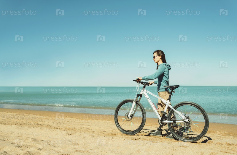 Девушка прогуливается с велосипедом на пляже