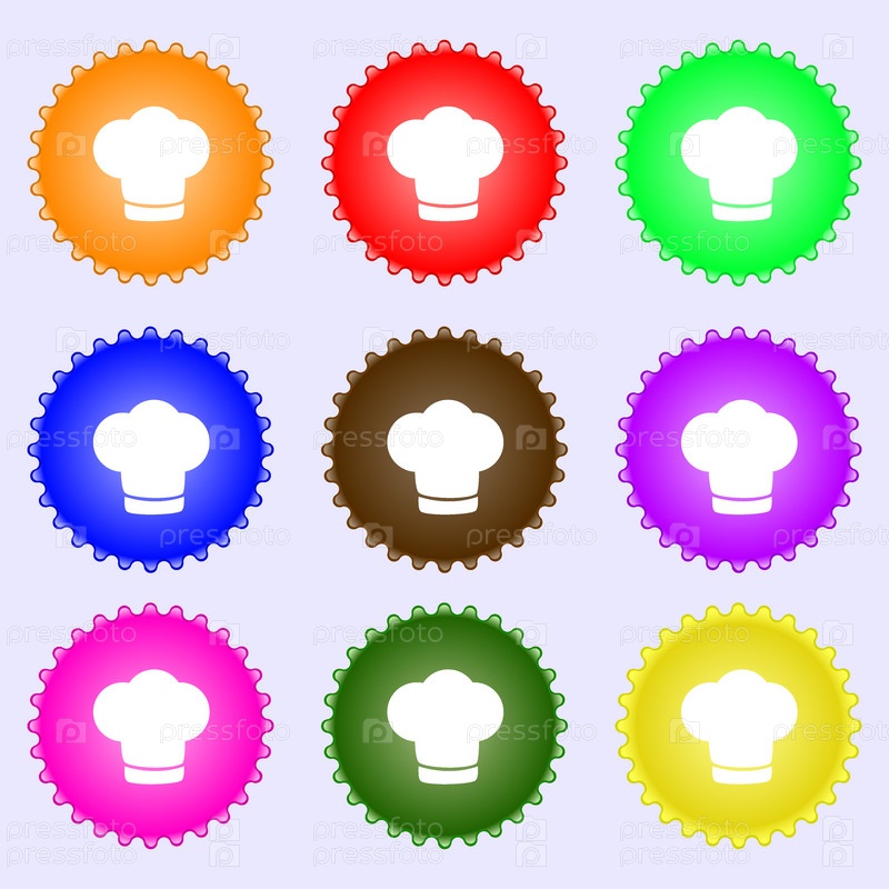 Шеф-повар шляпу знак значок. Приготовление символ. Повара шляпу. Набор из девяти различных цветных этикеток. Вектор