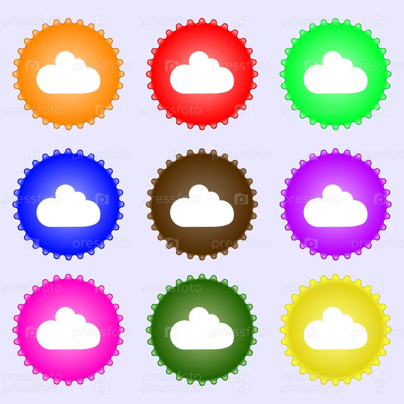 Облако знак значок. Символ для хранения данных. Набор из девяти различных цветных этикеток. Вектор