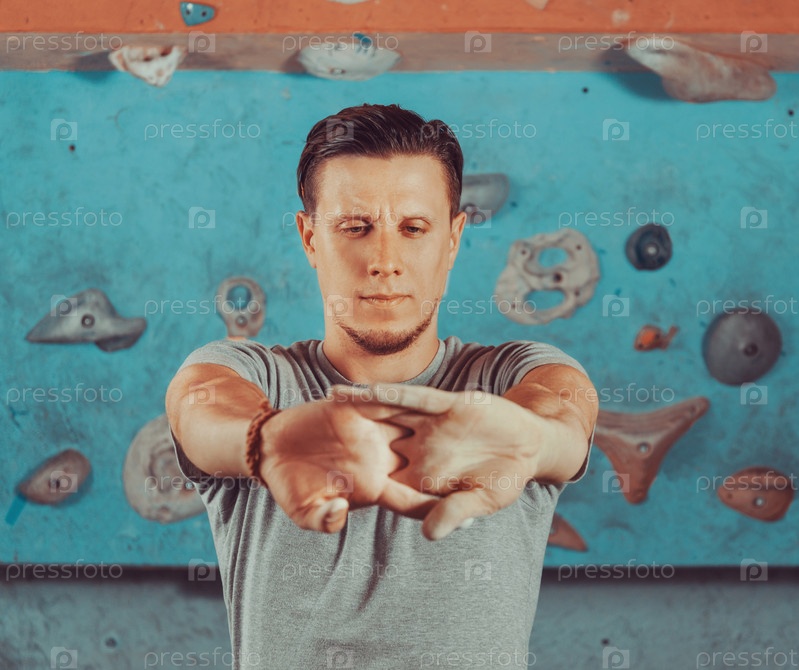 Молодой человек, разминается перед восхождением