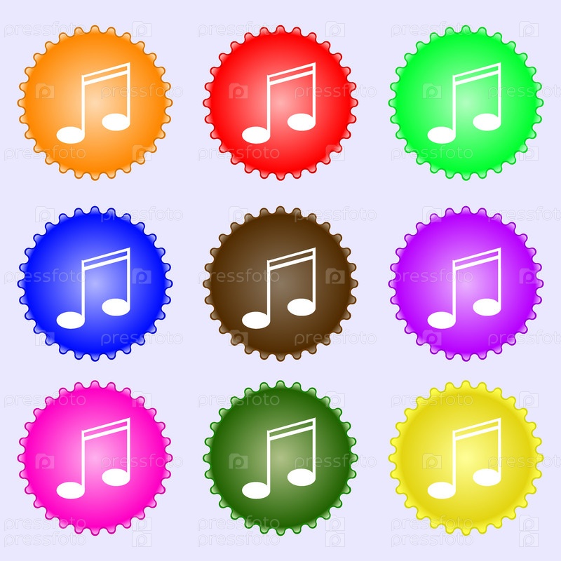 Музыка Примечание знак значок. Музыкальным символом. Набор из девяти различных цветных этикеток. Вектор