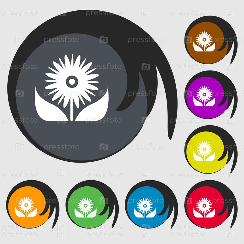 Букет цветов с лепестками значок знак. Символы на восьми цветных кнопок. Вектор