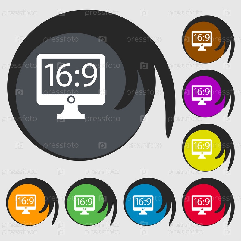 Соотношение сторон 16 9 широкоэкранный ТВ значок знак. Символы на восьми цветных кнопок. Вектор