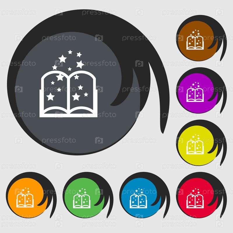 Магический знак значок книги. Открытая книга символ. Символы на восьми цветных кнопок. Вектор
