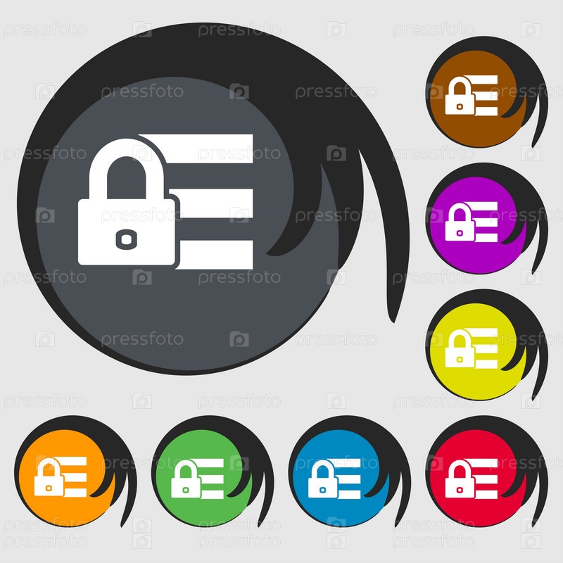 Замок, войти значок. Символы на восьми цветных кнопок. Вектор
