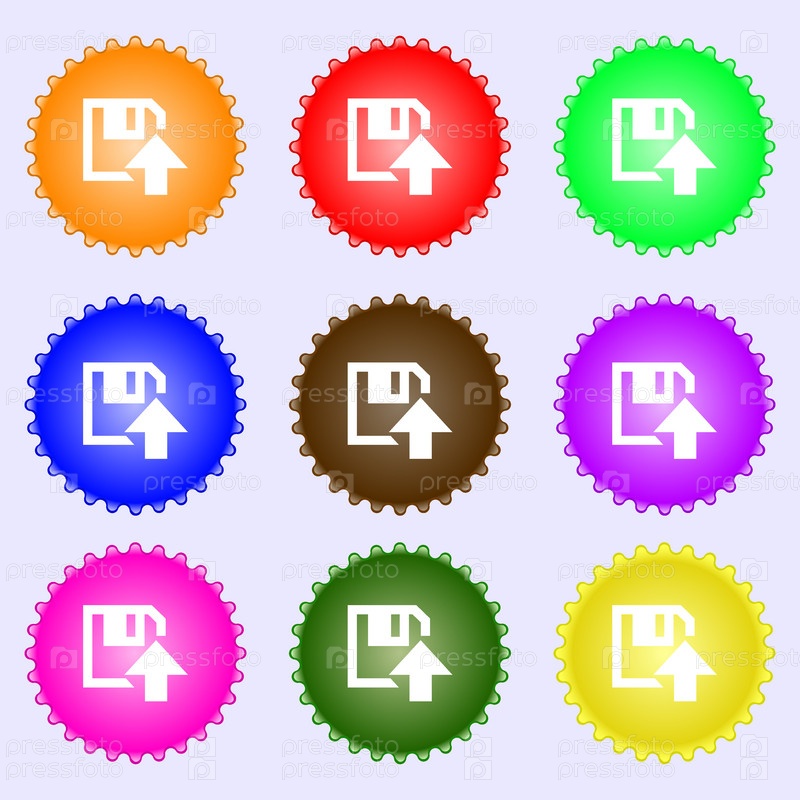 Значок дискеты. Плоский современный дизайн. Набор из девяти различных цветных этикеток. Вектор