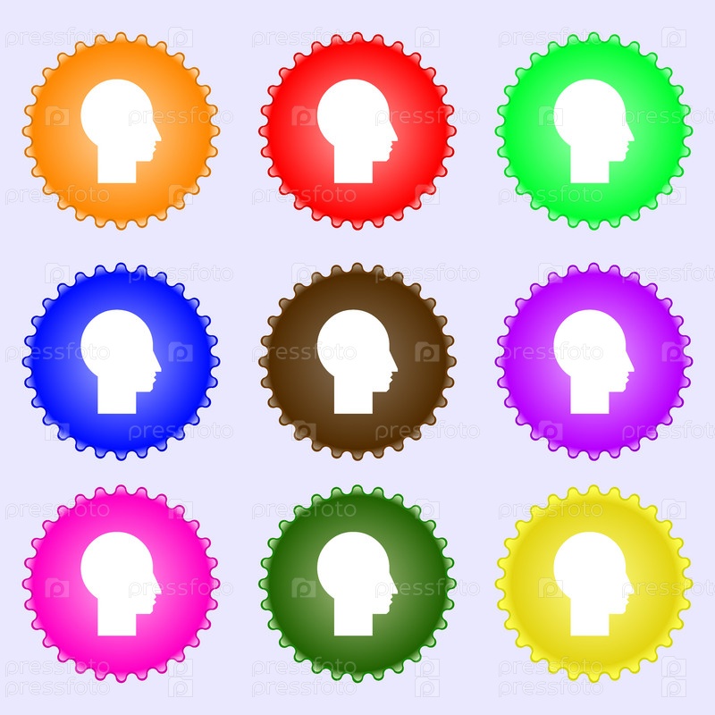 Иконка Пользователь знак. Символ человека. Красочные кнопки установки. Набор из девяти различных цветных этикеток. Вектор