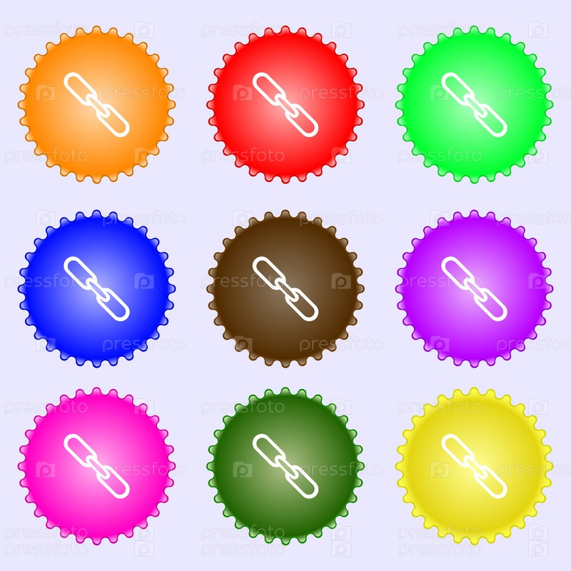 Знак значок ссылки. Символ гиперссылке цепи. Набор из девяти различных цветных этикеток. Вектор