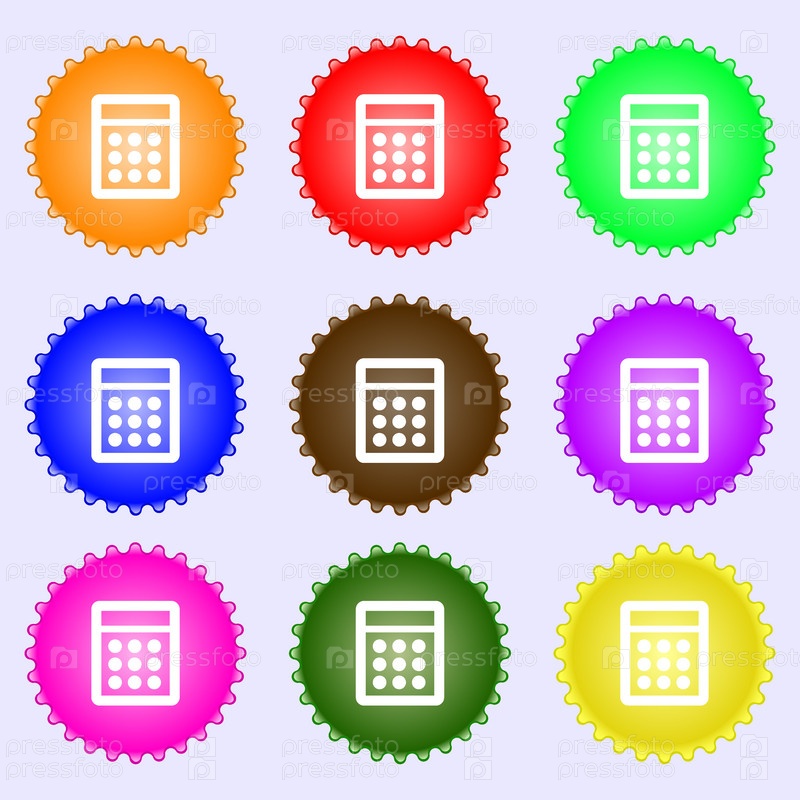 Иконка Калькулятор знак. Символ бухгалтерского учета. Набор из девяти различных цветных этикеток. Вектор