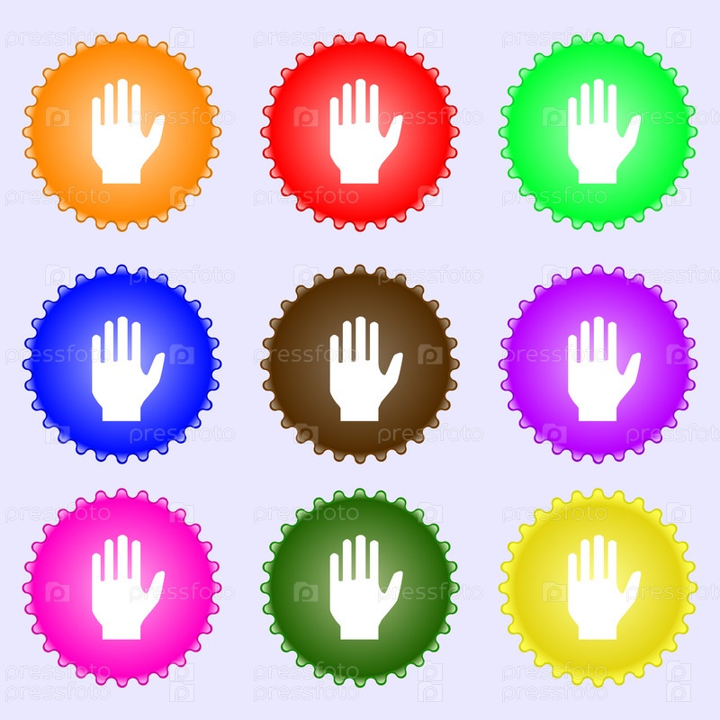 Значок печати знак руки. Остановите символ. Набор из девяти различных цветных этикеток. Вектор