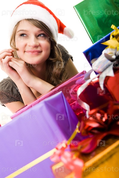 Портрет улыбающейся женщины, думающей о рождественском подарке
