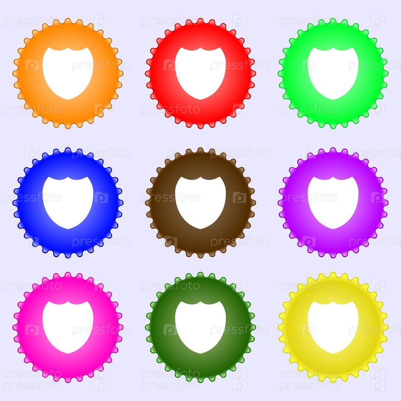 Значок щита знак. Символ защиты. Набор из девяти различных цветных этикеток. Вектор