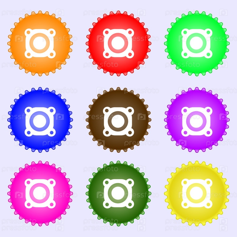 Значок знак громкости динамика. Символ звука. Набор из девяти различных цветных этикеток. Вектор