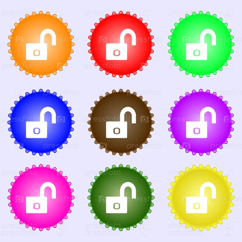 Значок замка знак. Локера символ. Набор из девяти различных цветных этикеток. Вектор