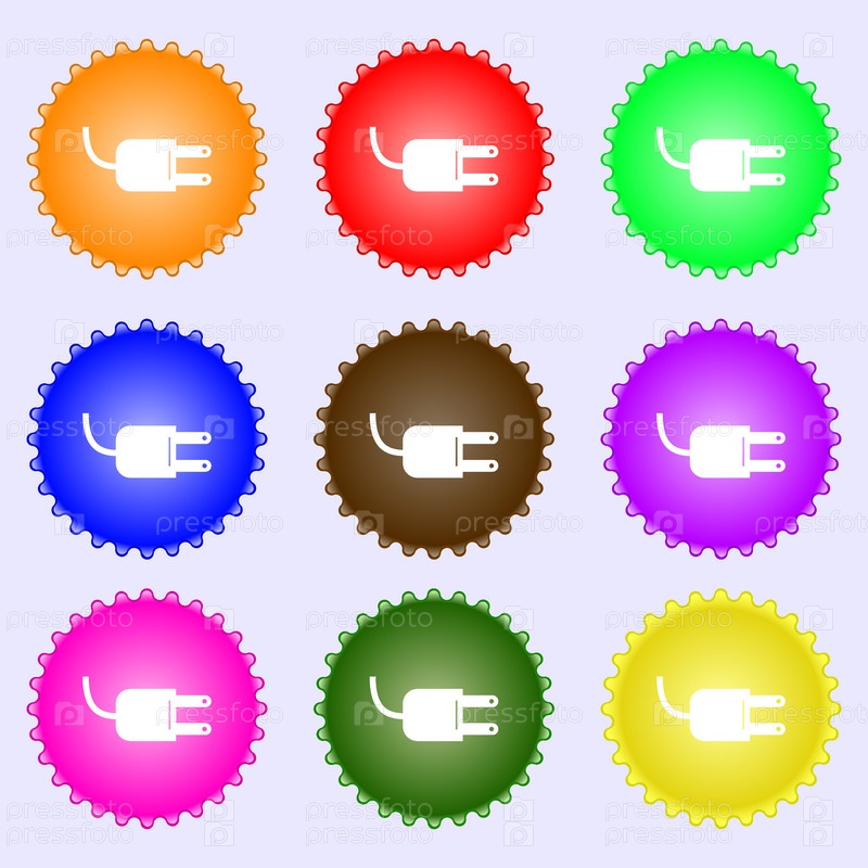 Электрическая вилка знак значок. Символ мощность энергии. Набор из девяти различных цветных этикеток. Вектор