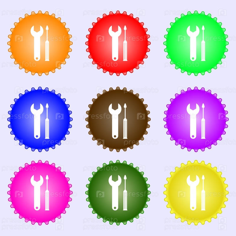Ремонт инструмента знак значок. Символ службы. Отвертка с помощью гаечного ключа. Набор из девяти различных цветных этикеток. Вектор