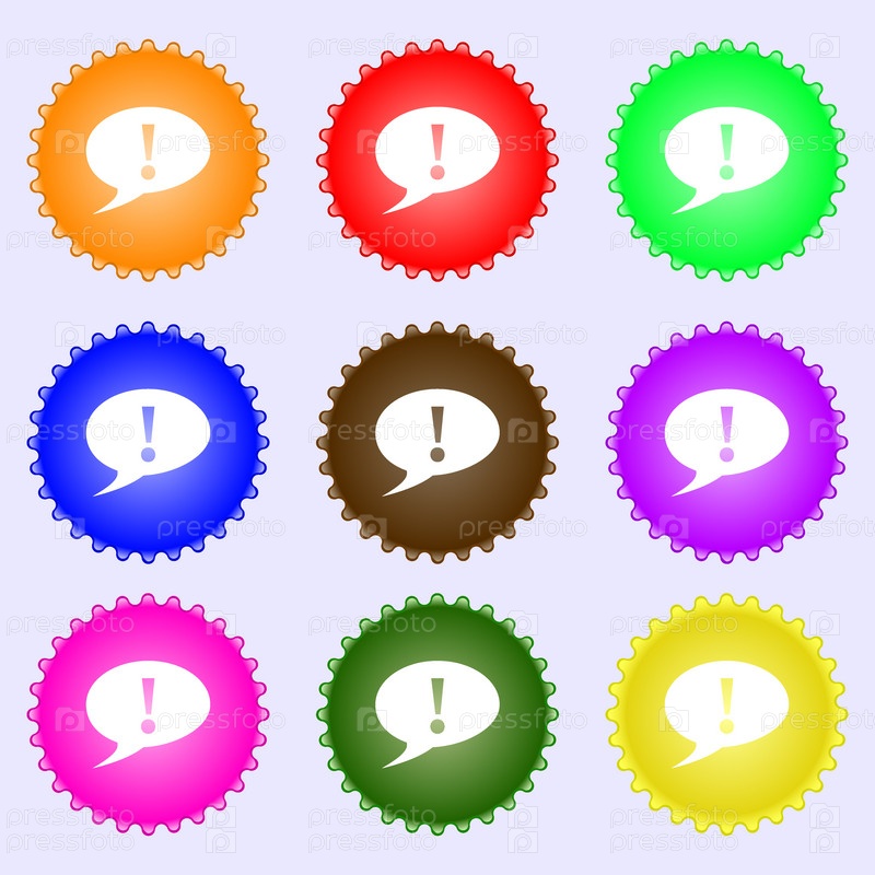 Знак восклицательный знак. Внимание речи пузырь символ. Набор из девяти различных цветных этикеток. Вектор