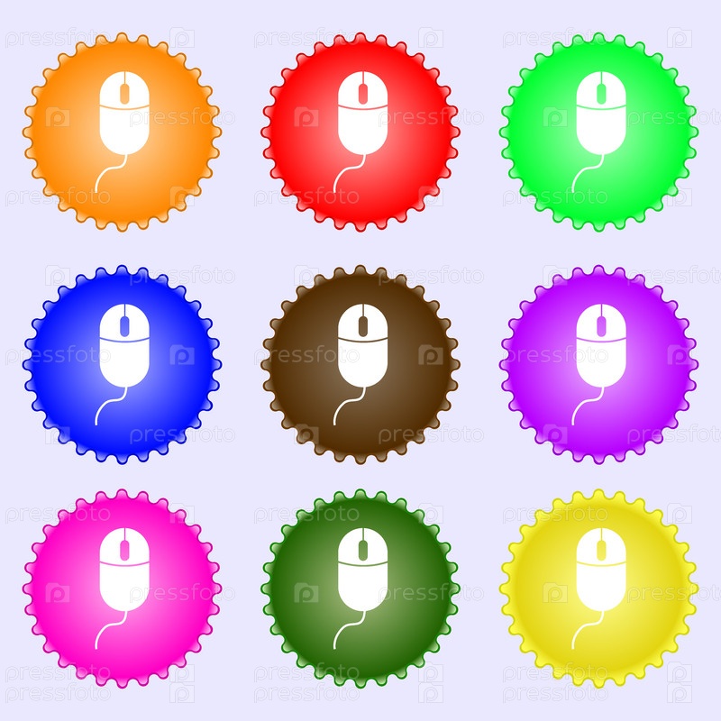 Компьютерная мышь знак значок. Оптический с символом колесо. Набор из девяти различных цветных этикеток. Вектор