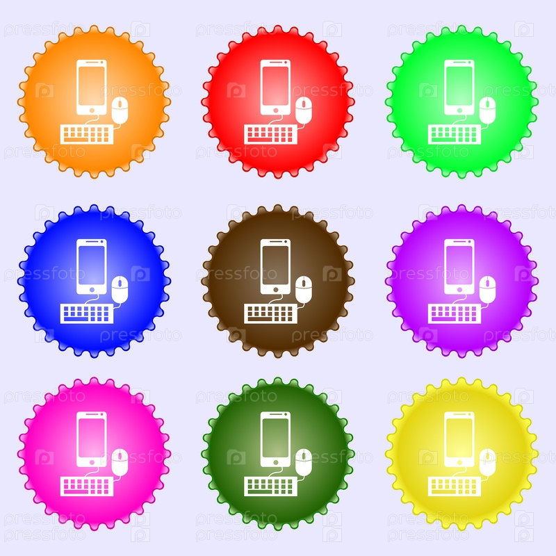 Смартфон широкоформатный монитор, клавиатура, мышь знак значок. Набор из девяти различных цветных этикеток. Вектор
