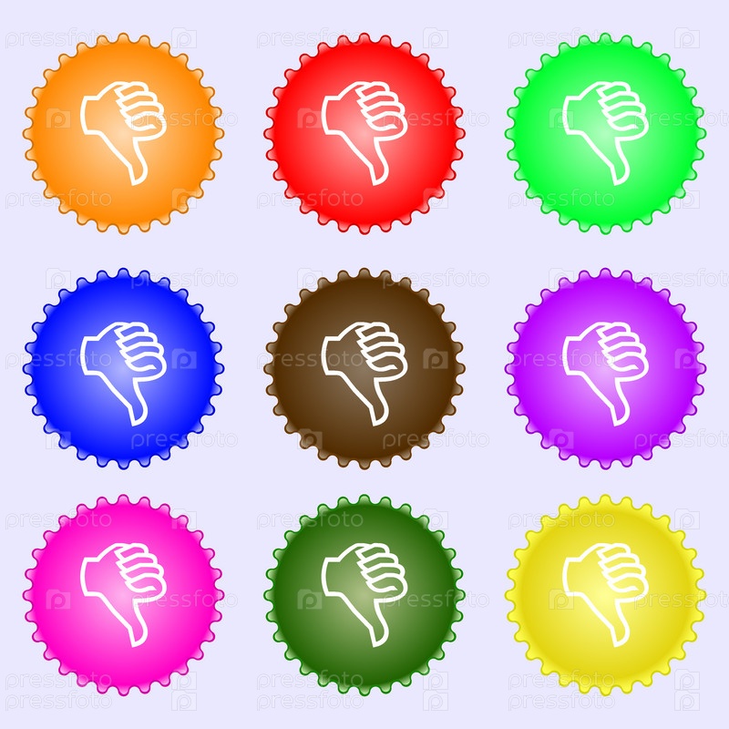 Не нравится значок знак. Большой палец вниз. Палец руки вниз символ. Набор из девяти различных цветных этикеток. Вектор
