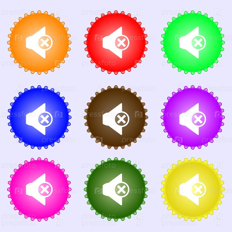 Значок звука динамика знак. Символ звука. Набор из девяти различных цветных этикеток. Вектор