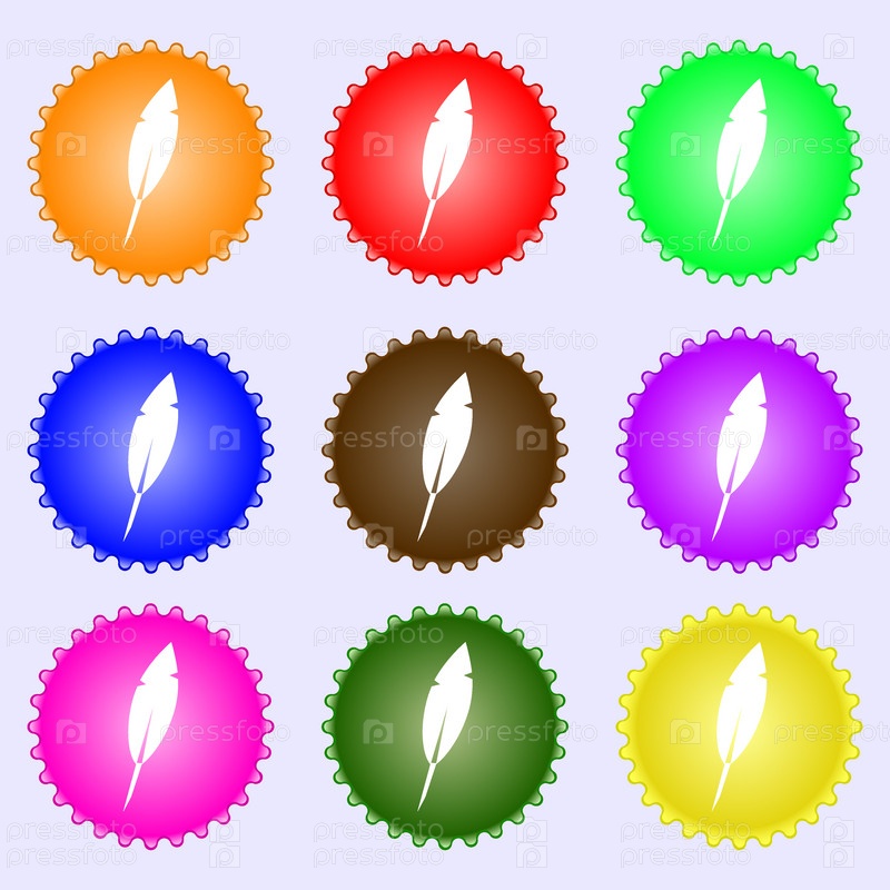 Пером знак значок. ретро пера. Набор из девяти различных цветных этикеток. Вектор