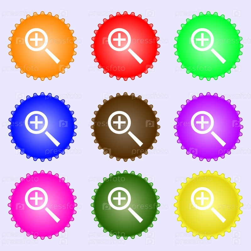 Лупа стекла, зум инструмент значок знак. Набор из девяти различных цветных этикеток. Вектор