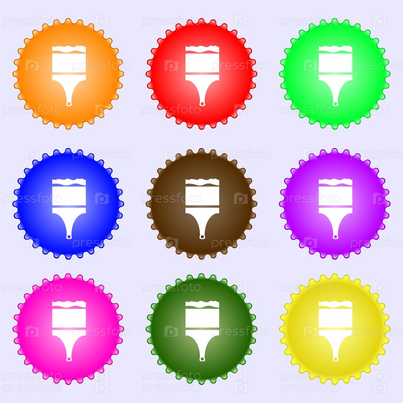 Краска кисти знак значок. Символ художник. Набор из девяти различных цветных этикеток. Вектор