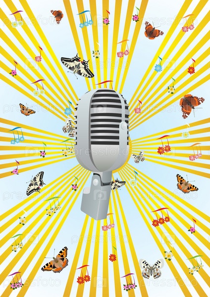 Микрофон на фоне бабочек и солнечный лучей