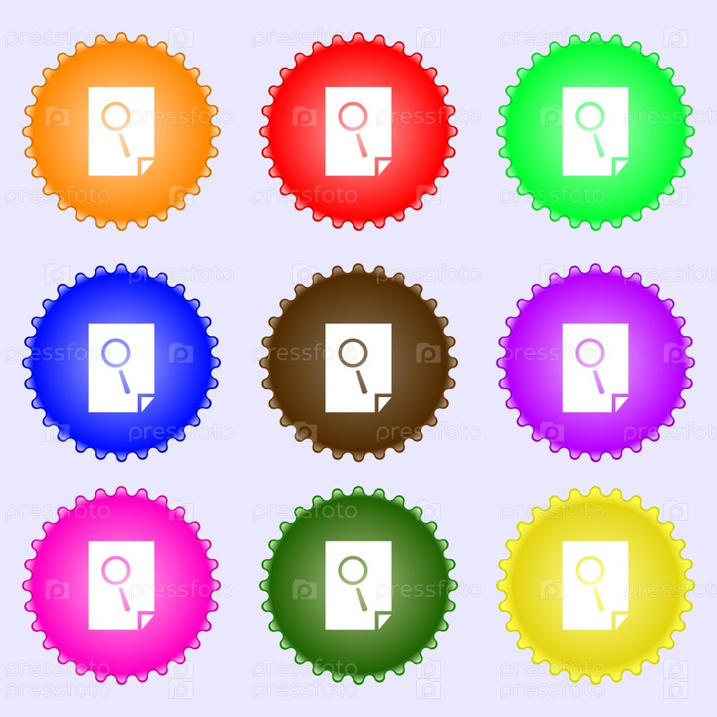 Поиск в знак значок файла. Найти символ документа. Набор из девяти различных цветных этикеток. Вектор