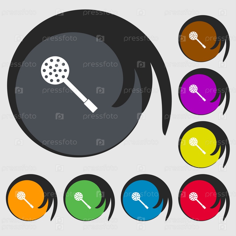 Кухонные приборы значок знак. Символы на восьми цветных кнопок. Вектор