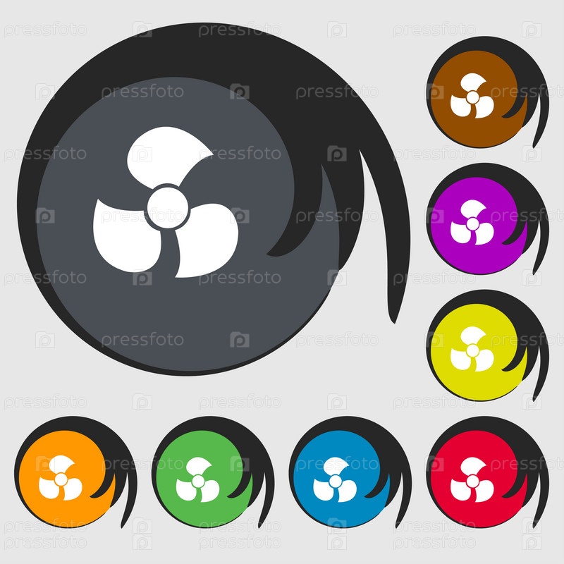 Вентиляторы, пропеллер значок знак. Символы на восьми цветных кнопок. Вектор