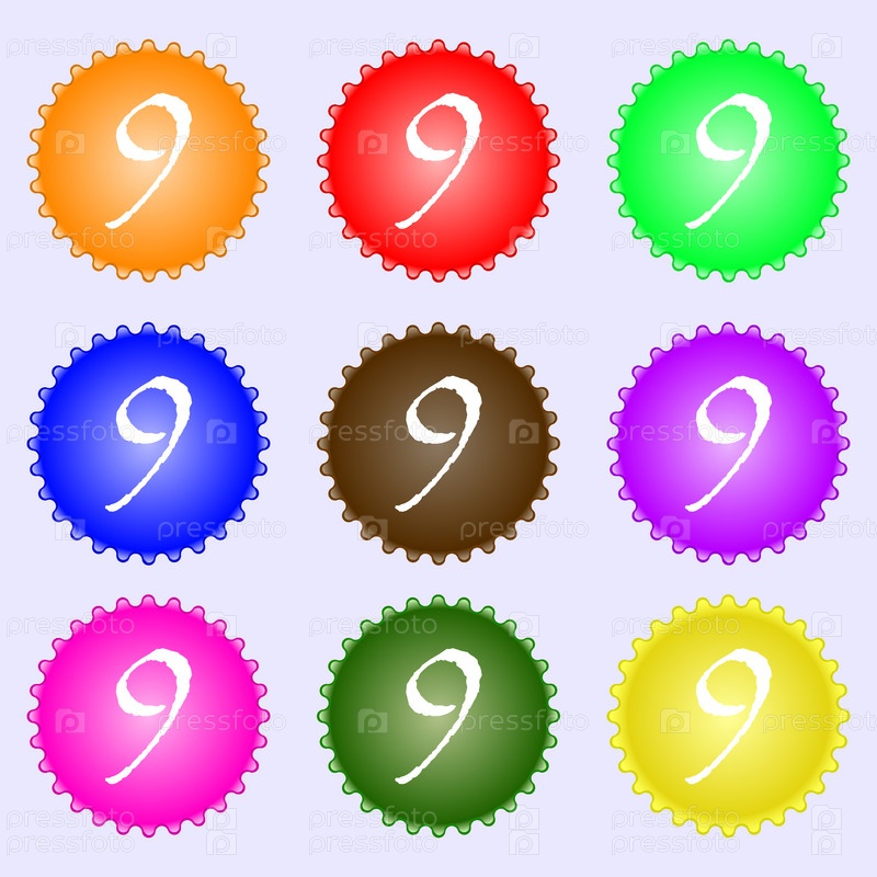 Номер девять значок знак. Набор из девяти различных цветных этикеток. Вектор