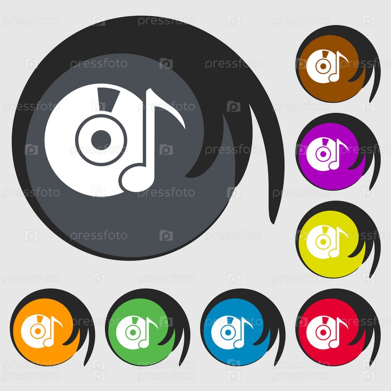Знак значка на компакт-диске или DVD. Символы на восьми цветных кнопках. Вектор