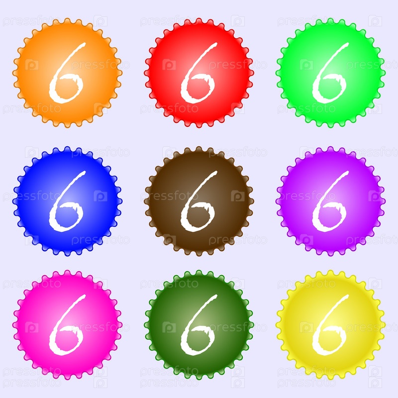 Номер шесть значок знак. Набор из девяти различных цветных этикеток. Вектор