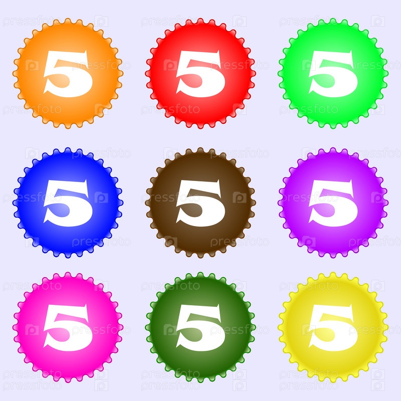 Номер пять значок знак. Набор из девяти различных цветных этикеток. Вектор