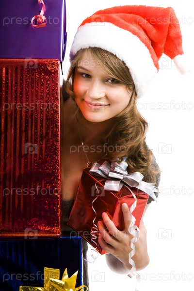 Портрет красивой девушки, держащей подарок за кучей ящиков