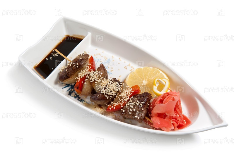 Шашлык из рыбы на тарелке в форме лодки
