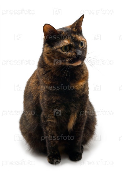 Трехцветная кошка черепаховой окраски сидит на белом фоне